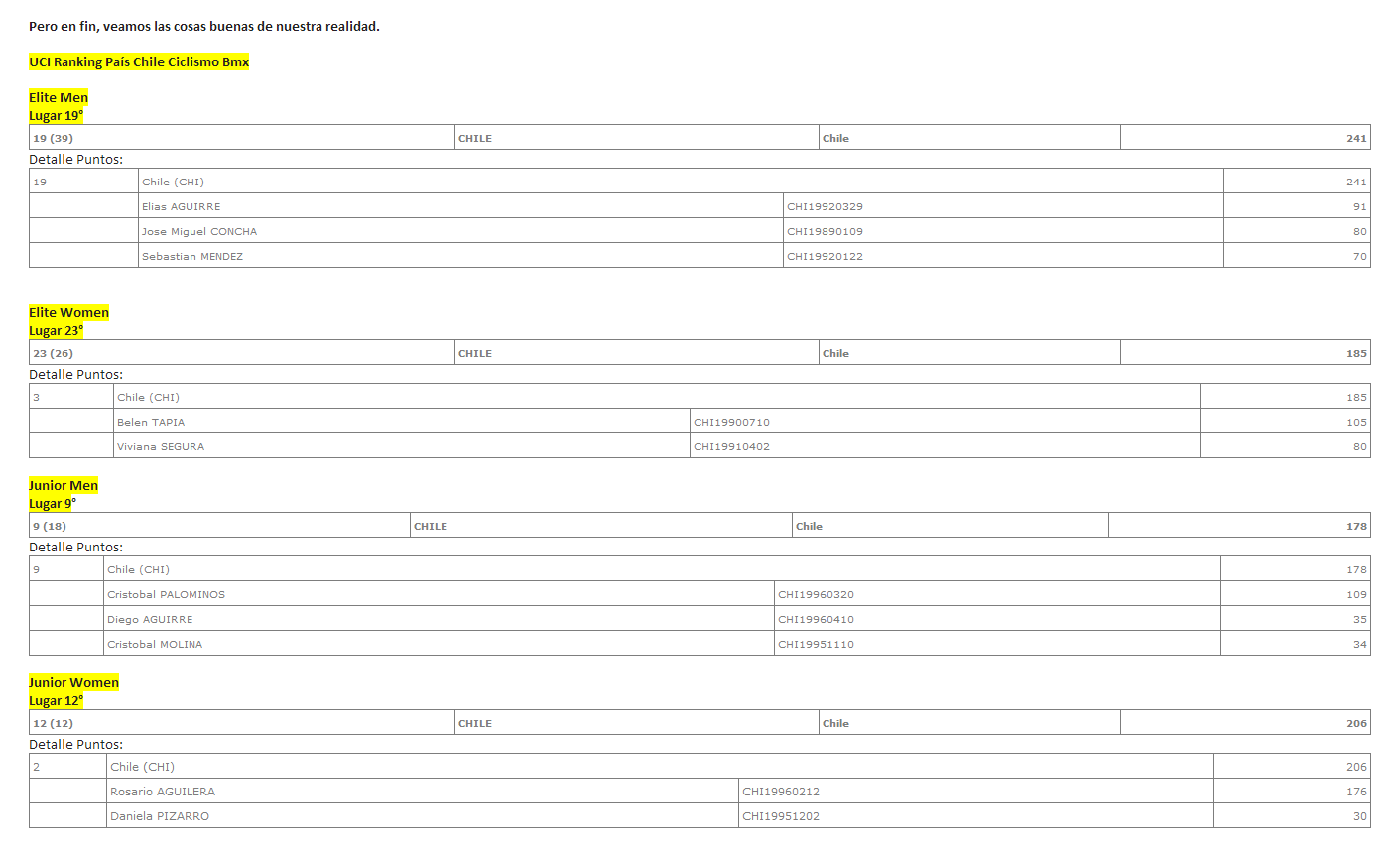 CHILE EN EL RANKING MUNDIAL JUNIOR Y ELITE